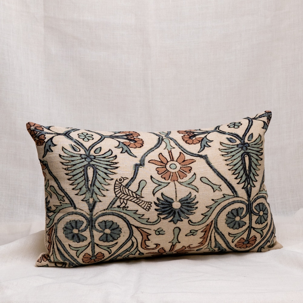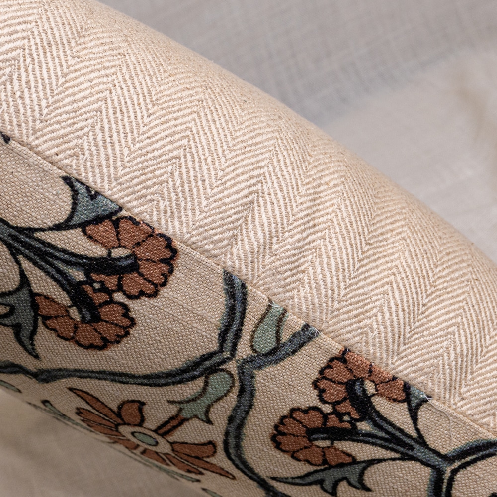 Cojín hecho con tela de Güell Lamadrid, con un estampado divertido y elegante de motivos geométricos y flores en tonos azules y tierras sobre fondo natural. Trasera con tela de tapicería con dibujo de espiga en color natural.