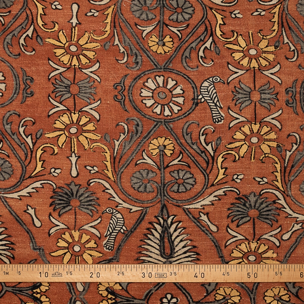 Lino Kay Terracota Güell es un elegante lino estampado con motivos florales en tonos terracotas.
