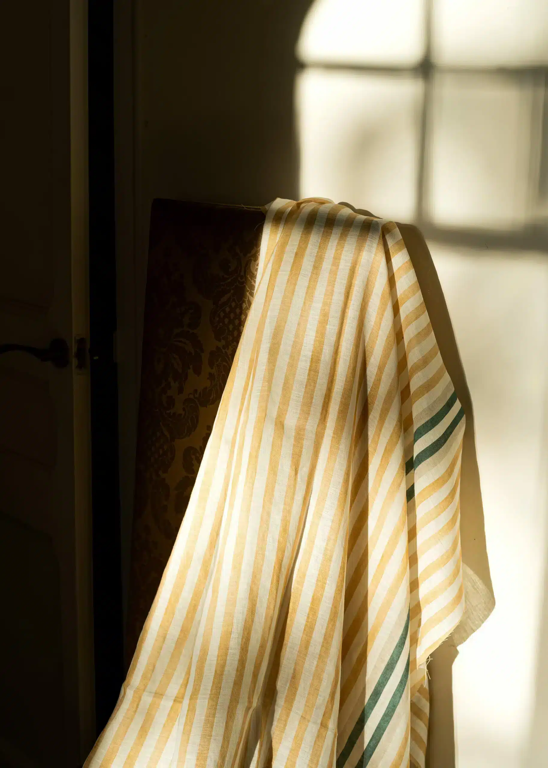 La tela Luz y Sombra Curry de Coordonné es un diseño inspirado en rayas en amarillo/blanco de la colección Palacio de Cristal Fabrics.