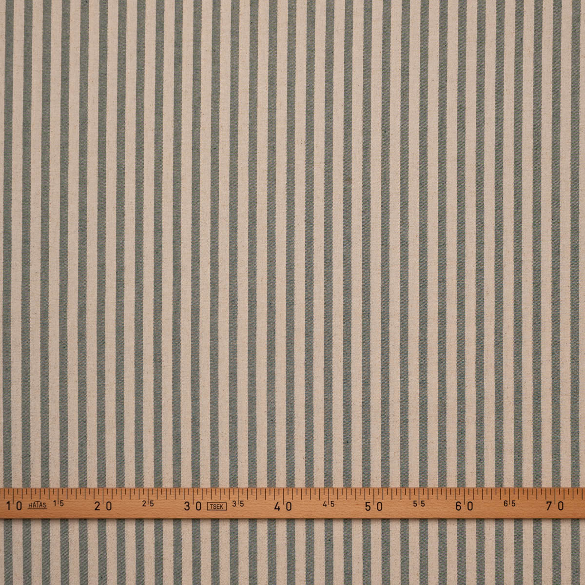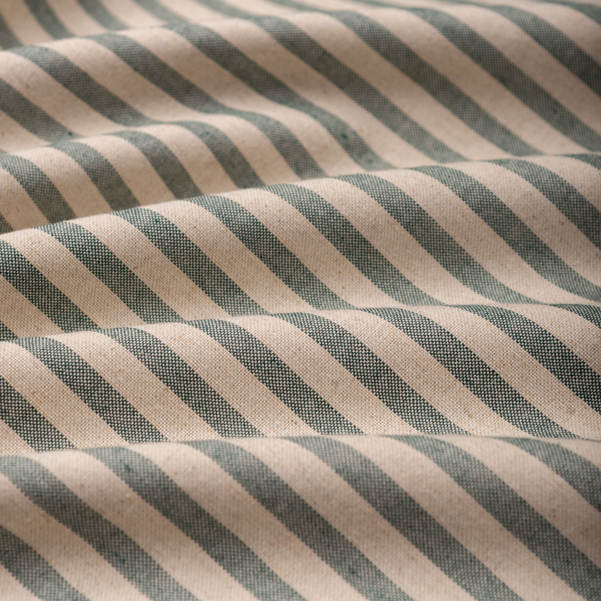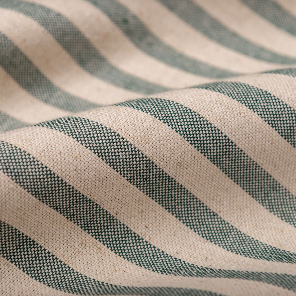 Loneta con rayas pequeñas tejidas en color verde botella sobre fondo color natural. Tela ideal para tapicería decorativa de poco uso como descalzadoras, bancos, etc y para confección de cortinas, colchas, cojines y decoración en general. También podemos hacer manteles ya que se lava muy bien y no necesita mucha plancha.