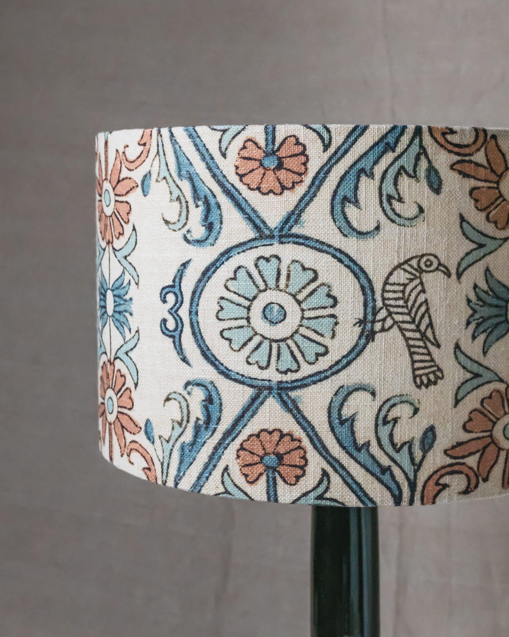 Pantalla de lámpara Kay Guell de tela estampada geométrica y flores azules y tierras, hecha a mano.