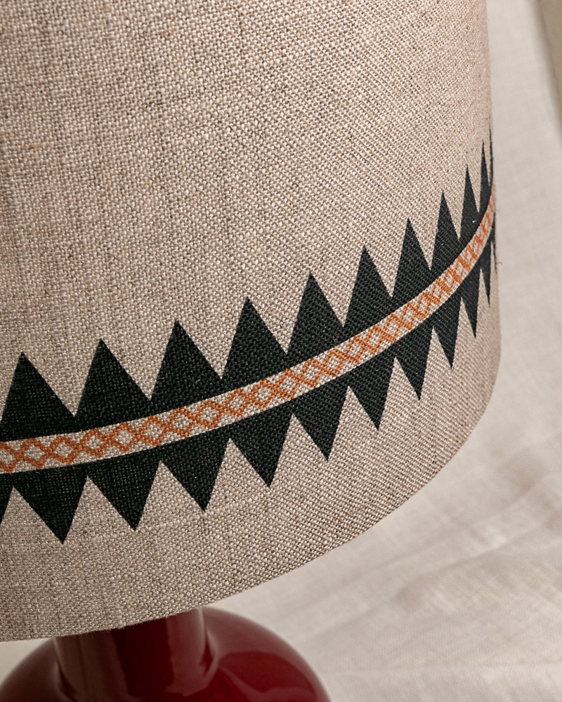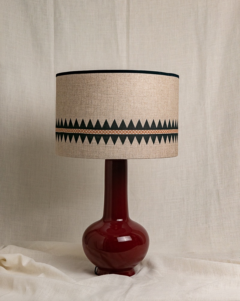 Pantalla redonda para lámpara, hecha a mano con lino color piedra estampado con línea de picos negros.