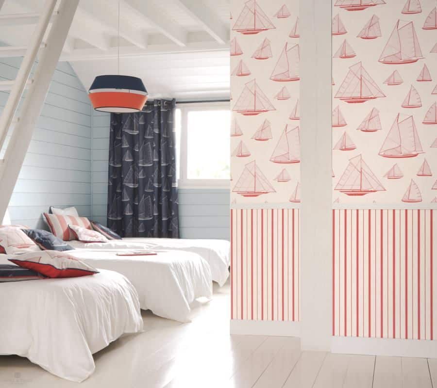Papel pintado con un original estampado de barcos pequeños y grandes, disponible en cuatro tonalidades bicolor, que nos da la posibilidad de elegir entre la combinación de tonos azules claros y oscuros, azul o rojo con blanco o grises y beiges. Los patrones de esta colección se caracterizan por sus colores profundos y relajantes, sus imágenes llenas de historias increíbles y su espíritu cercano a la naturaleza. El modelo Riv sailor es un papel decorativo con un encanto especial que convierte cualquier habitación en una estancia única.