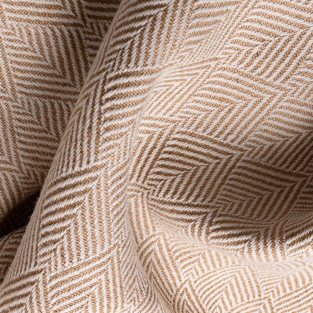 Tela de color beige natural y blanco, tejida en la propia tela un motivo geométrico como flechas hacia abajo. Por su gran calidad y resistencia es ideal para tapizar todo tipo de muebles. como cabeceros, bancos, sillas, sillones, butacas, etc. Esta tela tiene doble ancho lo que la hace muy versátil para todo tipo de confecciones de mucho uso. También es apta para la confección de cortinas o elementos decorativos del hogar.