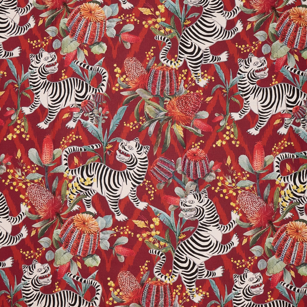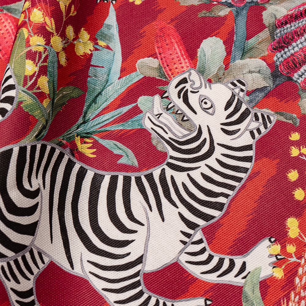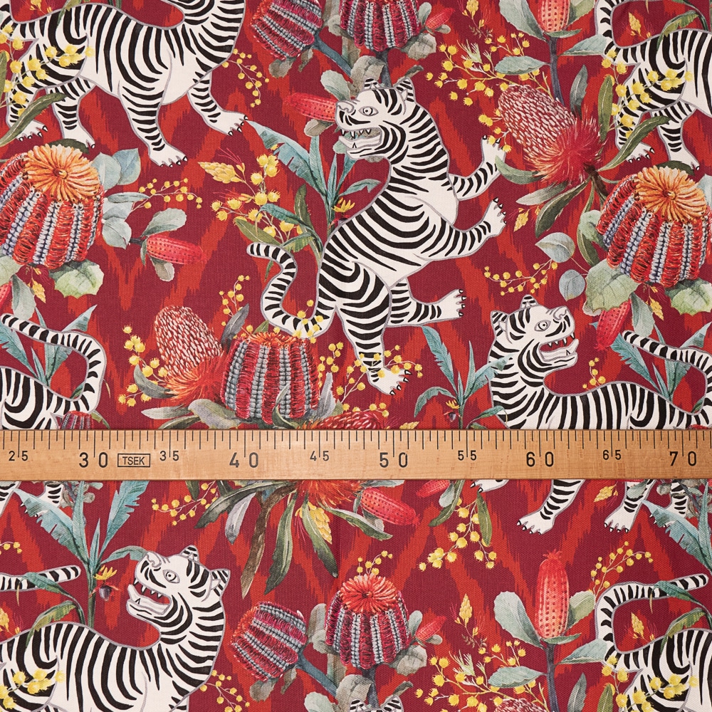 Tela Sizu es una base de algodón estampada en tonos rojos con tigres blancos y flores. Es Ideal para tapizar muebles de uso moderado como cabeceros, bancos, sillas, sillones, etc. Esta tela tiene doble ancho lo que la hace muy versátil para todo tipo de confecciones, como cortinas, colchas, cojines y cualquier artículo decorativo del hogar. También podemos hacer manteles ya que se lava bien. Se pueden también entelar paredes.