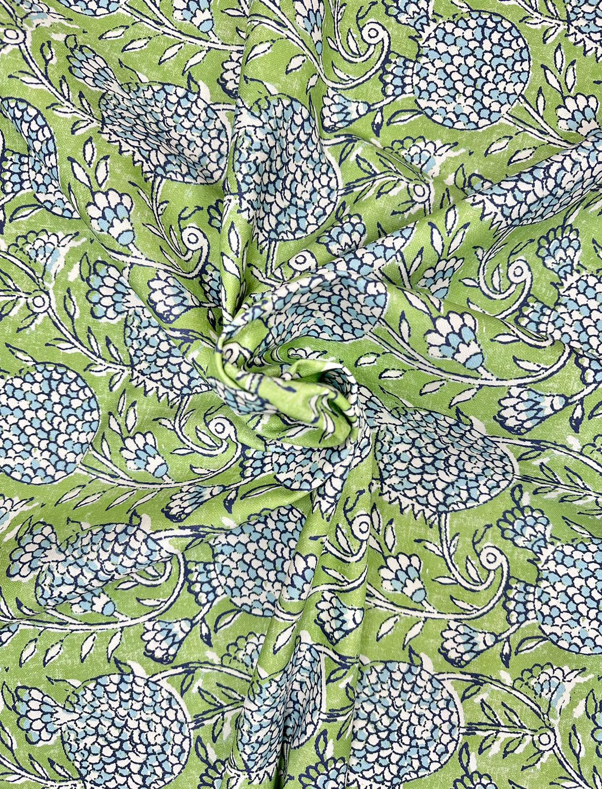 Tela fruto granado azul sobre un fondo verde. Tela con bonitas tonalidades en verdes y azules, ideal para tapizar muebles de uso moderado como butacas, bancos, sillas, etc. y también para hacer cortinas, estores, cojines, colchas, etc. Tiene una caída muy bonita y buen gramaje. También podemos hacer manteles ya que tiene doble ancho.