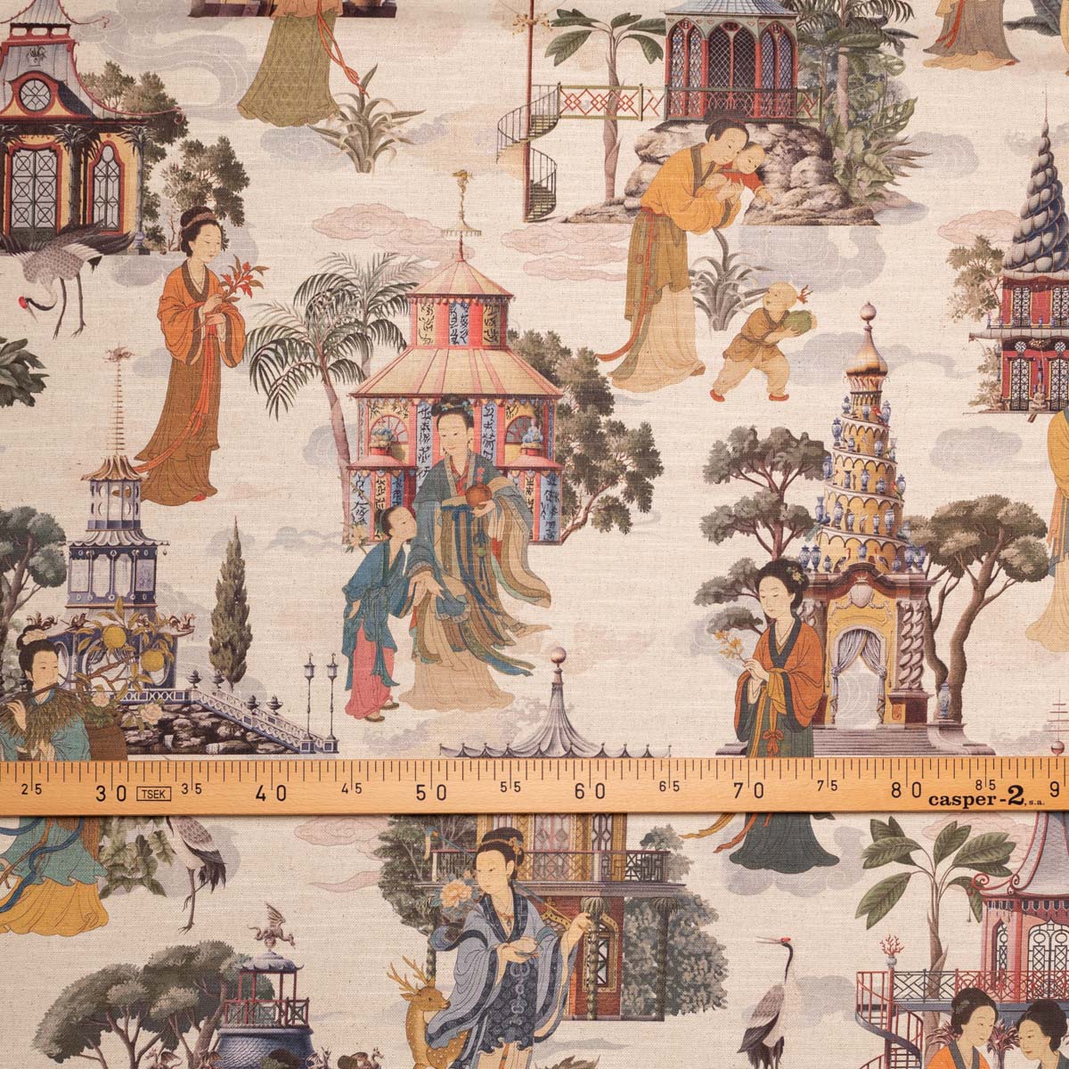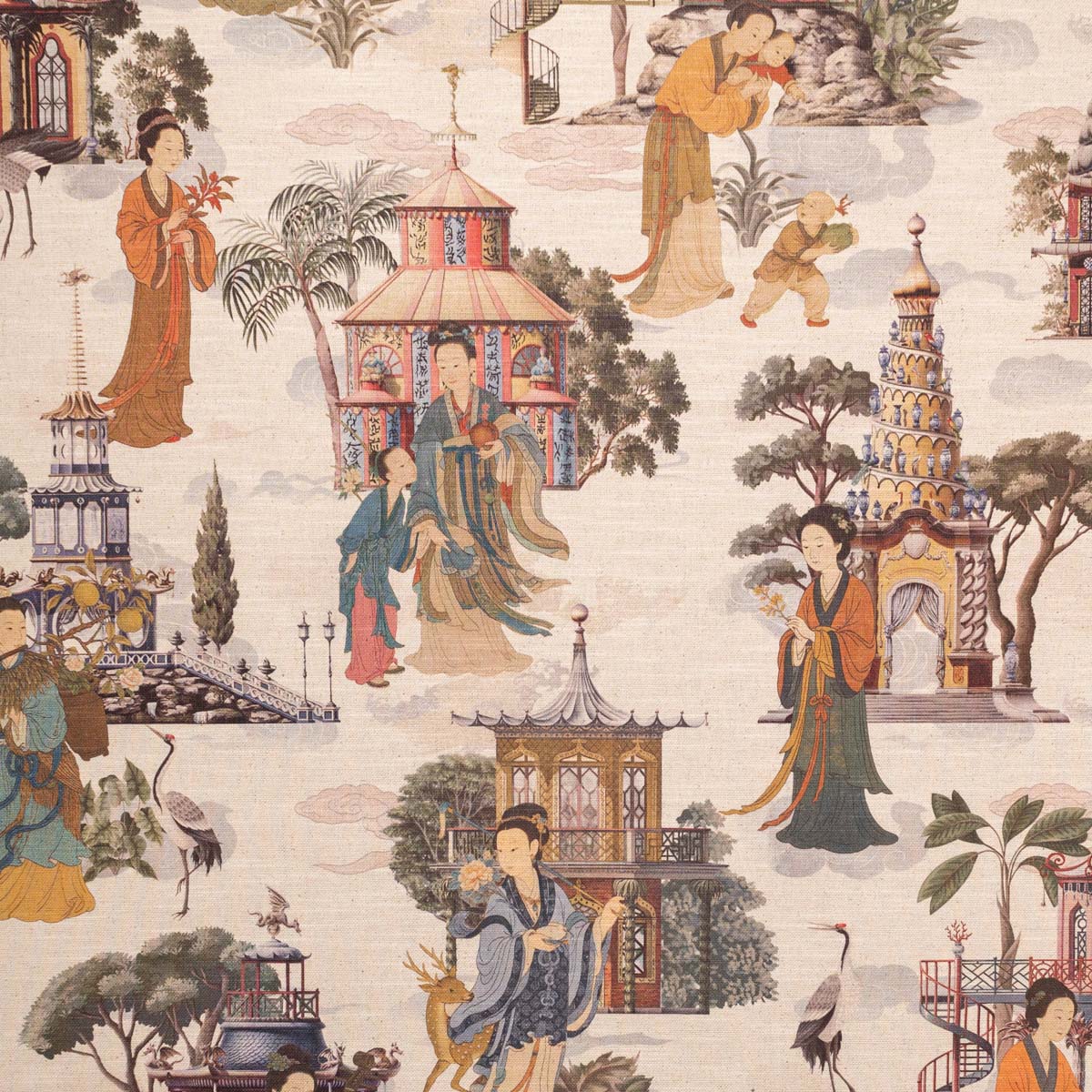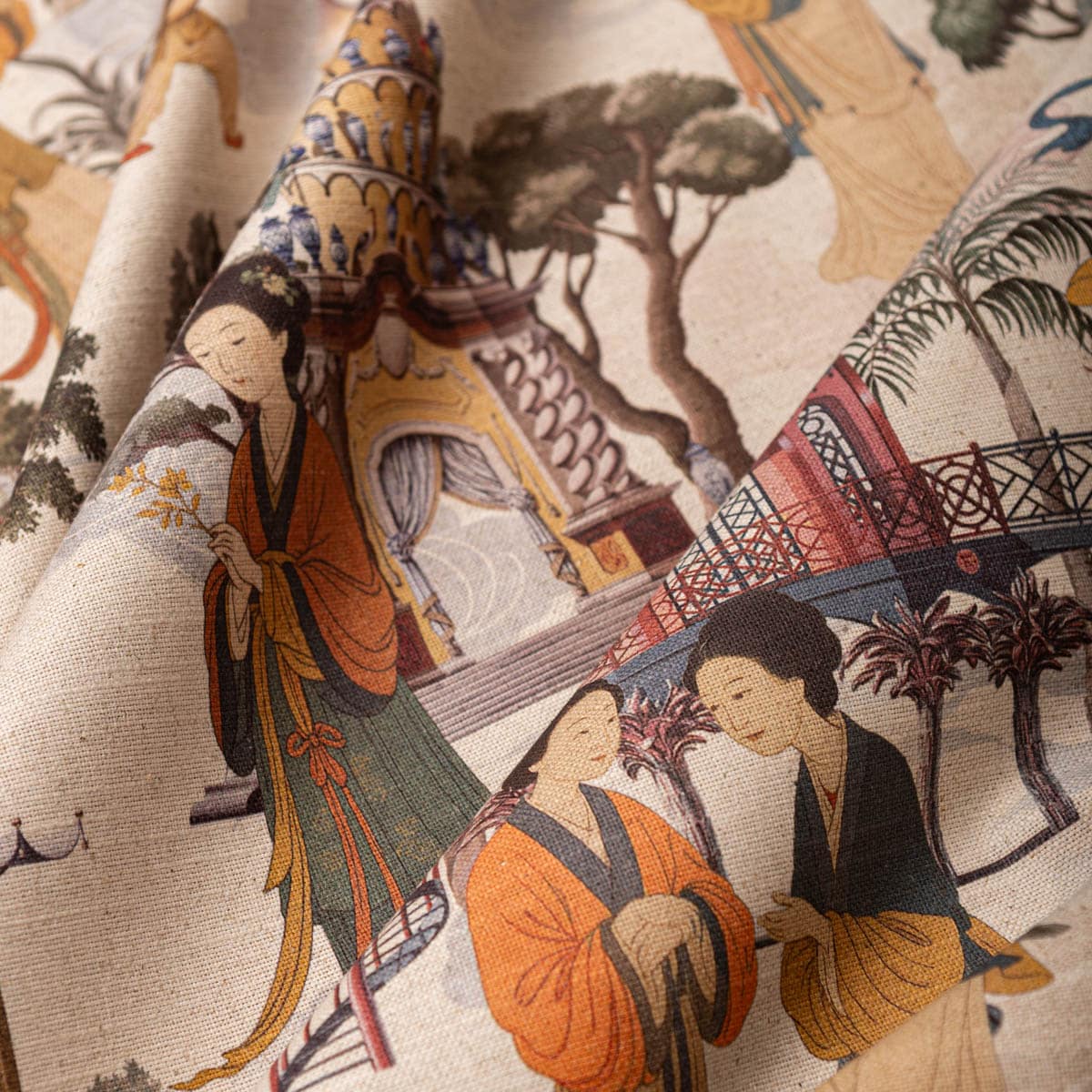 Jardines Imperiales es una tela de doble ancho en mezcla lino–poliéster que recrea paisajes chinoiserie con pagodas, grullas y figuras orientales en tonos suaves sobre un fondo natural. Combina la textura orgánica del lino con la resistencia y fácil cuidado del poliéster, logrando caída elegante y gran estabilidad.