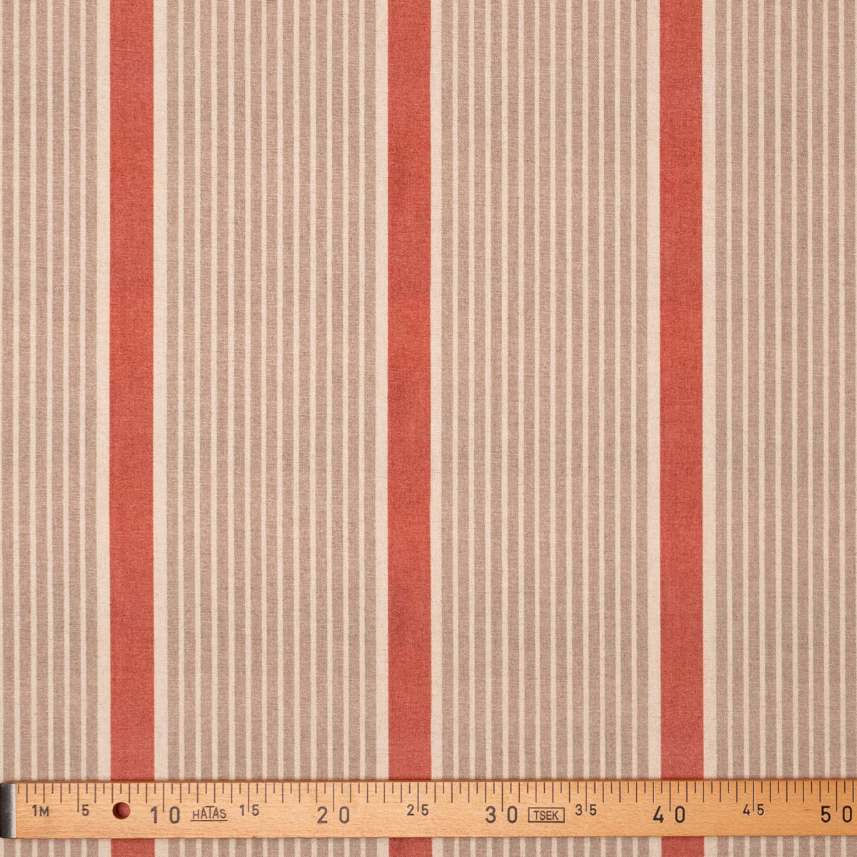 Tela de lino y algodón con diseño rayado que combina líneas finas en tono natural con bandas más anchas en un tono rosa, creando un equilibrio elegante y atemporal. Su estética sobria y cálida evoca el estilo mediterráneo y costero, aportando luminosidad y sensación de amplitud a los espacios.