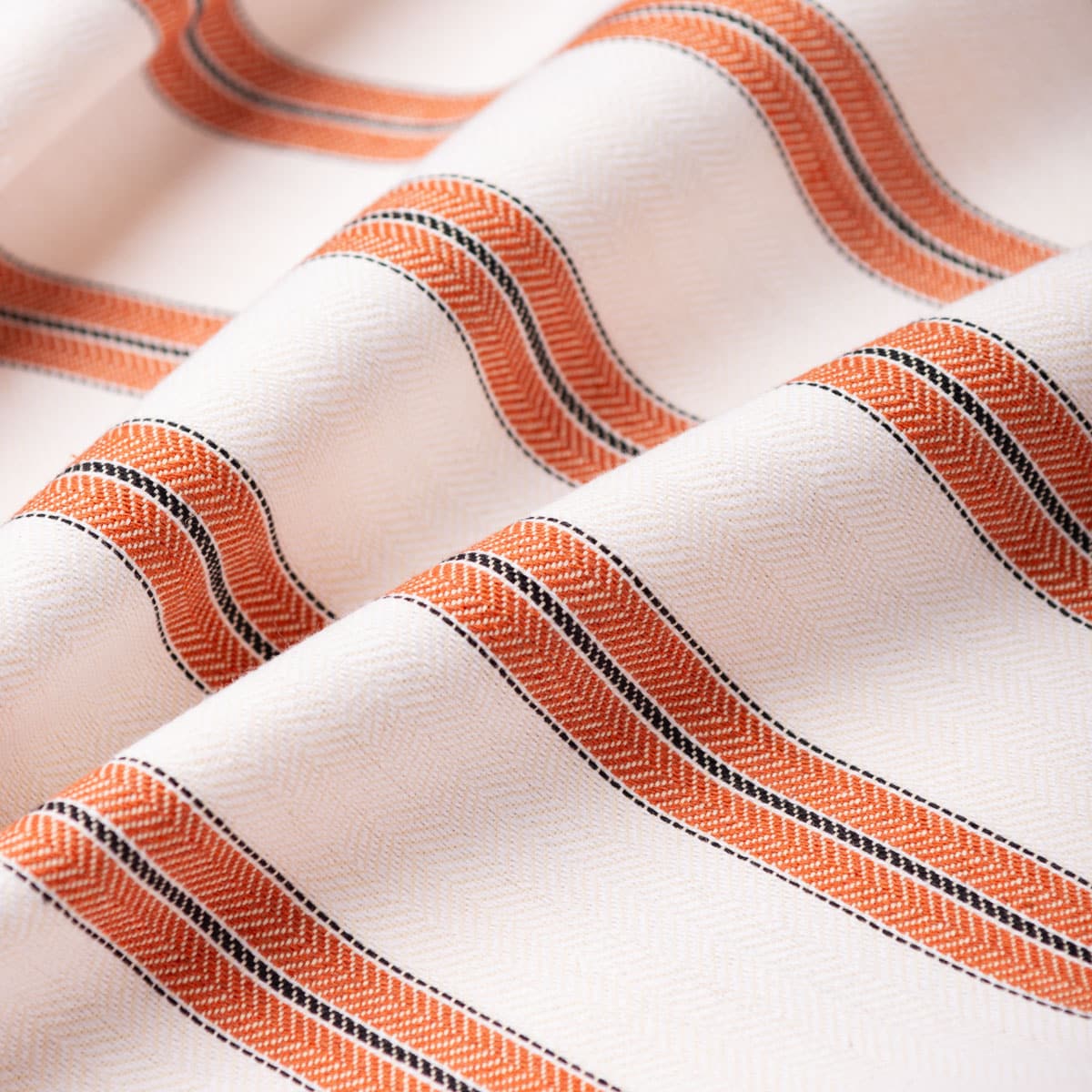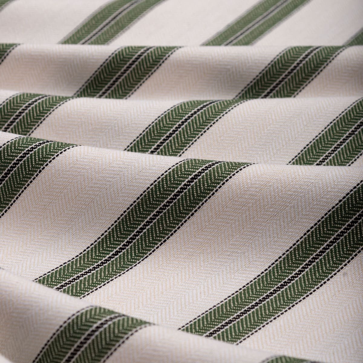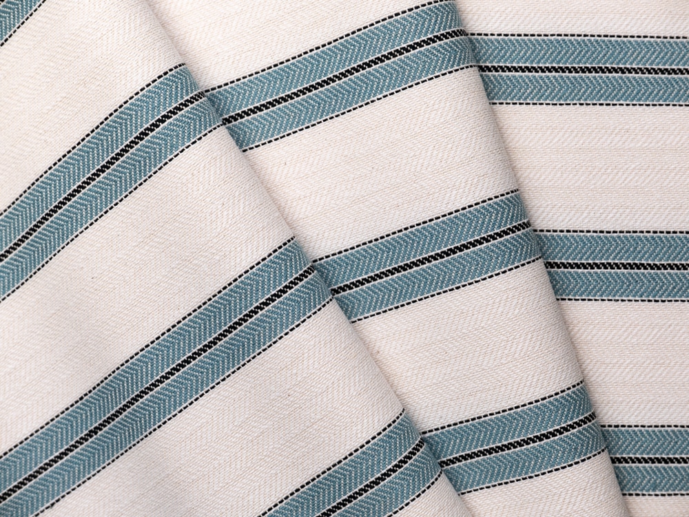 Tela Rayas Estepona es una tela hecha a base de algodón orgánico y poliéster reciclado. Esta tela está tejida haciendo dos pequeñas rayas de espigas en distintos colores, separadas por una fina línea negra también tejida, sobre fondo blanco roto. Ideal para tapizar muebles como butacas, descalzadoras, bancos, etc. y para confeccionar colchas, cortinas y elementos decorativos ya que tiene doble ancho. Podemos lavarla en casa y también hacer manteles con ella. Al tener las rayas tejidas y no estampadas la viveza de los colores no se ve afectada.