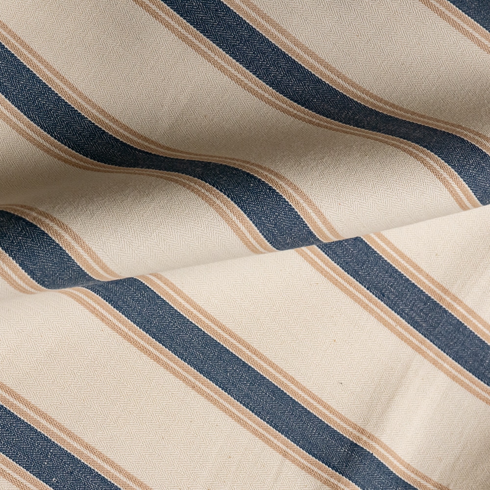 Tela de algodón con rayas en tono azul marino y otras rayas mas finitas al lado en tono beige, sobre un fondo de color blanco roto.
