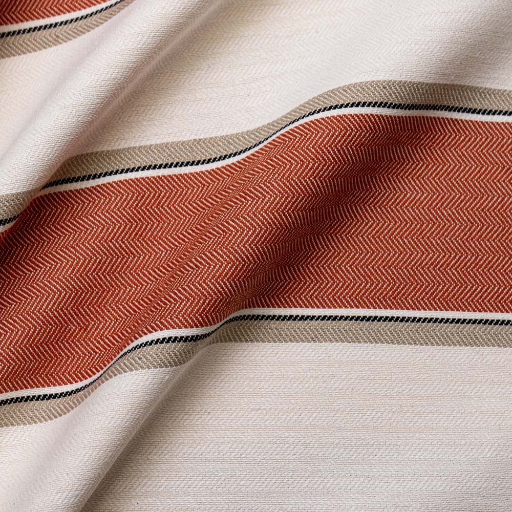 Tela Rayas Tejas Cadaqués es una tela hecha a base de algodón orgánico y poliéster reciclado. Esta tela esta tejida haciendo una pequeña espiga y con rayas en tonos teja, blanco roto y beige. Ideal para tapizar muebles como butacas, descalzadoras, bancos, etc. y para confeccionar colchas, cortinas y elementos decorativos ya que tiene doble ancho. Podemos lavarla en casa y también hacer manteles con ella. Al tener las rayas tejidas y no estampadas la viveza de los colores no se ve afectada.