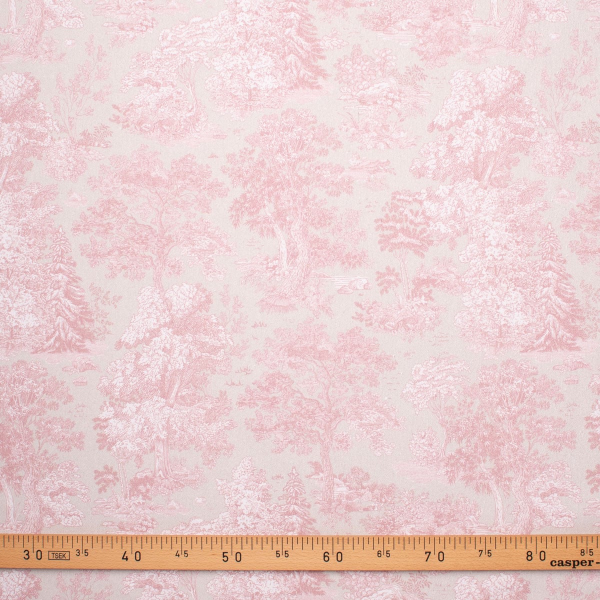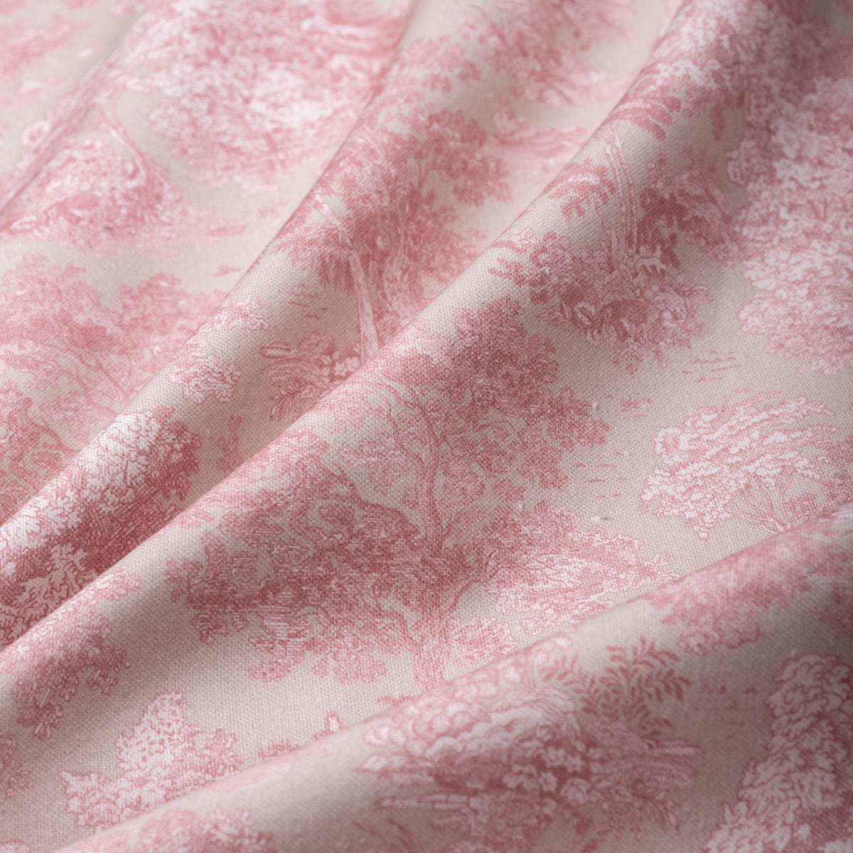 Tela Toile Rosa Provenza es un diseño tipo toile de jouy, que representa paisajes naturales con árboles, ilustrados en delicados tonos rosa pastel sobre un fondo claro en tono verde agua. Su estética clásica y romántica aporta elegancia y serenidad. Esta tela es ideal para la confección de cortinas, cojines, colchas y también es apta para tapizar muebles de uso moderado como cabeceros, butacas, descalzadoras, etc.